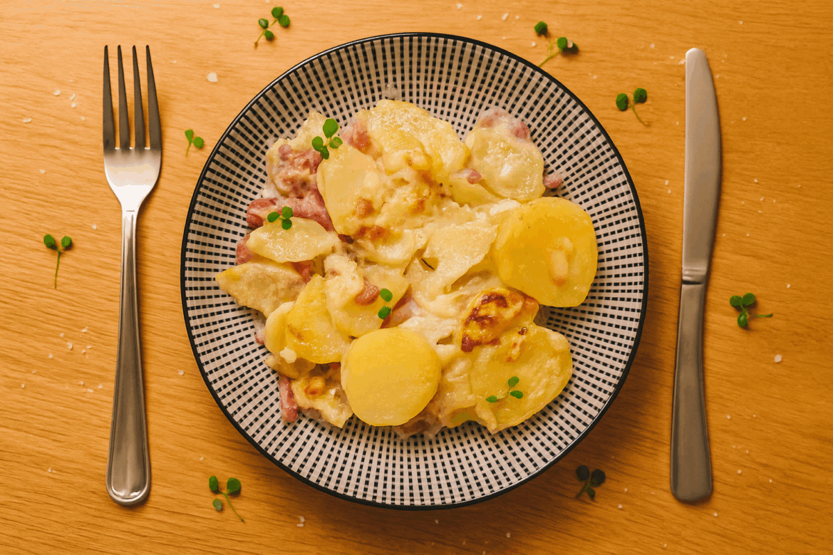 Gratin paysan de pommes de terre, sauce crémeuse au Valençay
